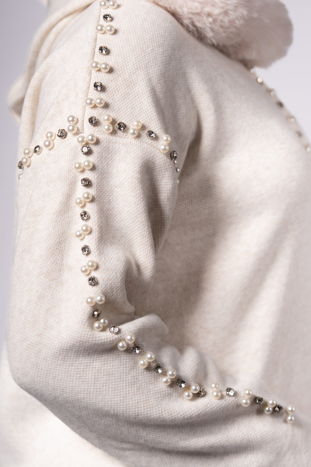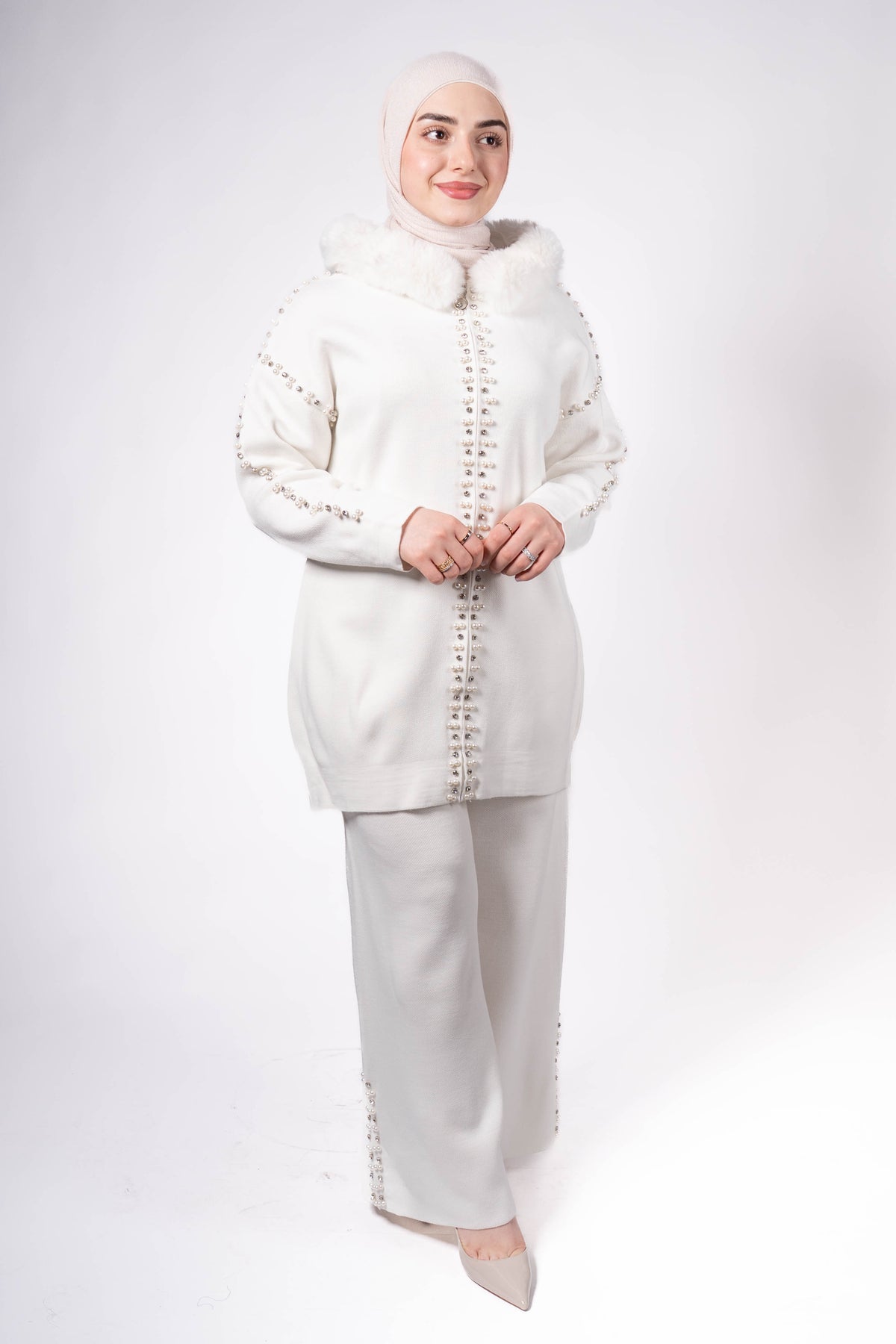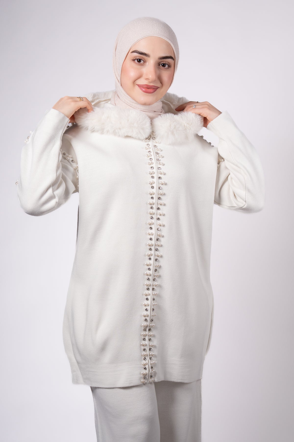 Top: Long tunic with faux fur collar (ivory), pearl details on front & sleeves – Length: 80 cm