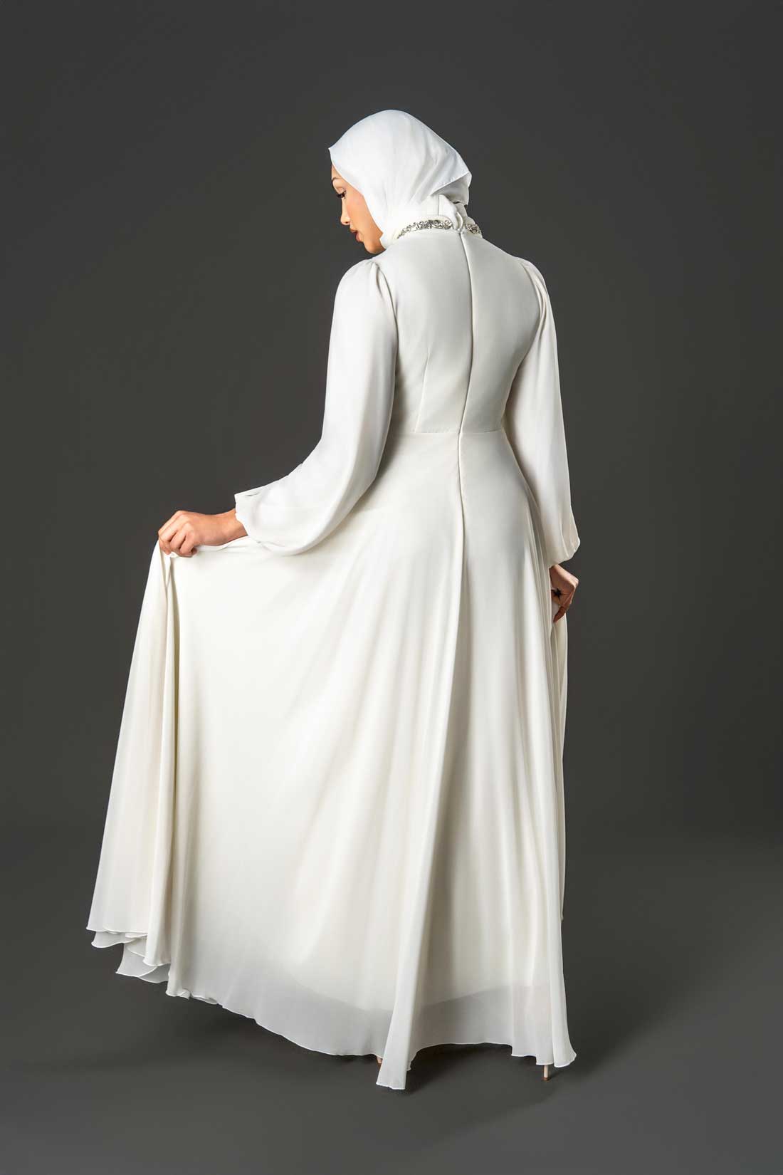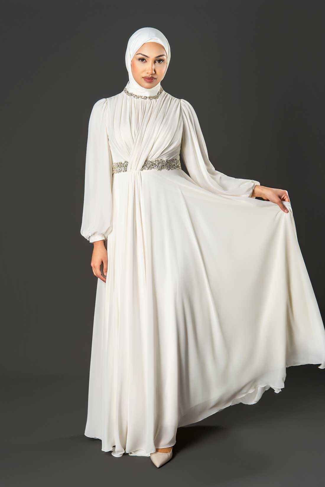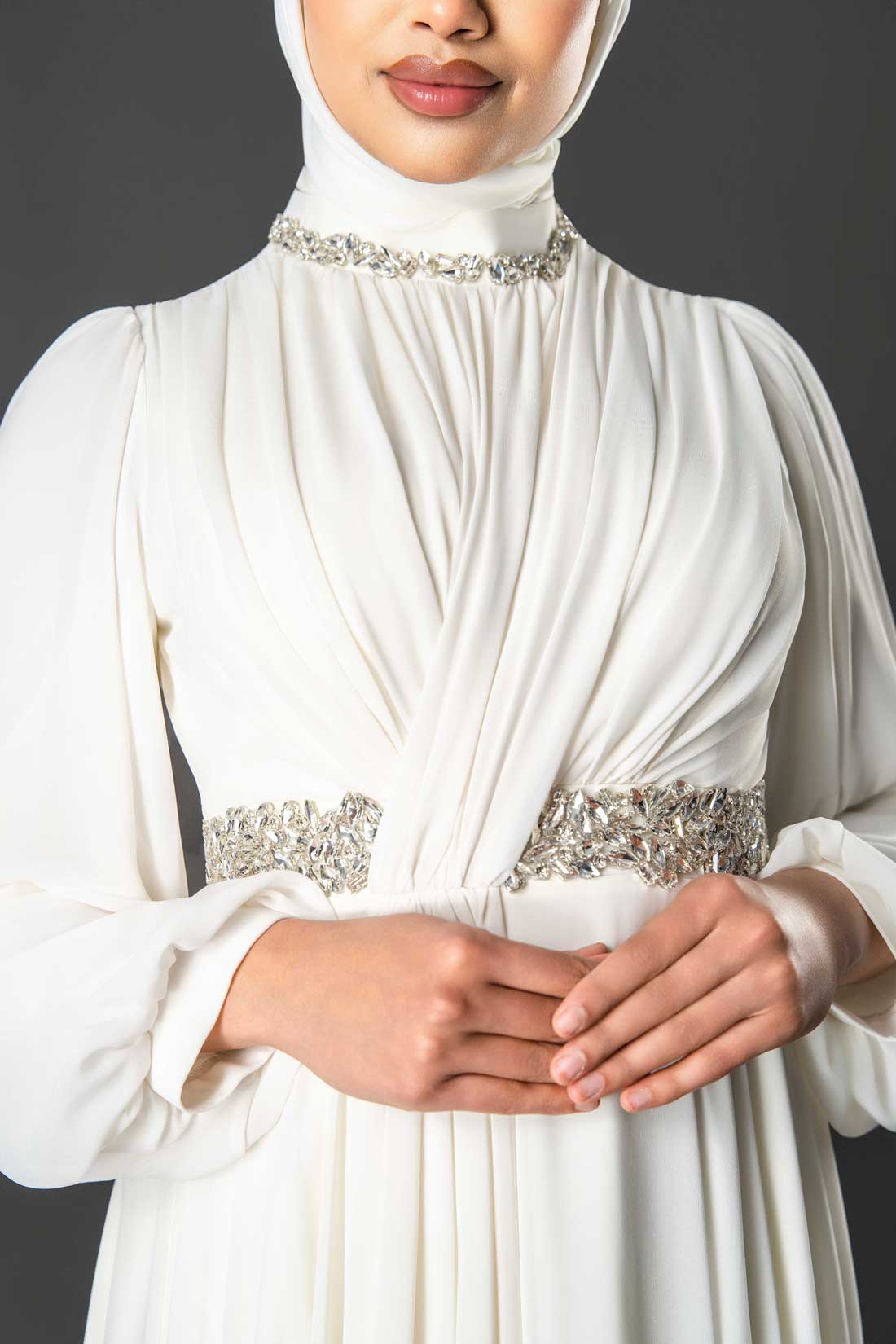 The high neckline and cinched embellished waistband create a beautifully balanced look — modest yet glamorous — perfect for special occasions, evening events, or celebrations.